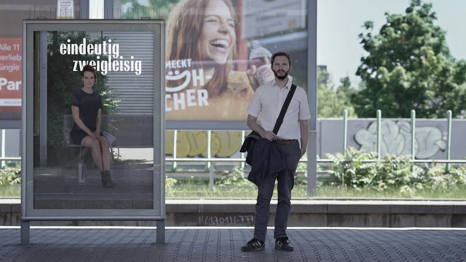 Der Film "Eindeutig Zweigleisig" verfolgte das Konzept, eine Geschichte ohne Dialoge zu erzählen und stattdessen visuelle Eindrücke zu nutzen. Eine Mann und eine Frau warten an gegenüberliegenden Bahngleisen auf ihre Züge, während ein Citylight-Plakatwechsler neben dem Mann steht. Die Plakate darin veranlassen die Frau dazu, den Mann mit den Abbildungen zu vergleichen und zu beurteilen. Dabei wird deutlich, dass sie ihn aufgrund seines Aussehens verurteilt. Der Zuschauer wird in die Perspektive der Frau eingebunden. Das Projekt wurde in Zusammenarbeit mit Anna Hinckel und Michelle Acosta umgesetzt. Neben der Konzeption führte ich Regie und war für die Postproduktion zuständig. Besonders faszinierend war die Arbeit an den VFX der Plakate.